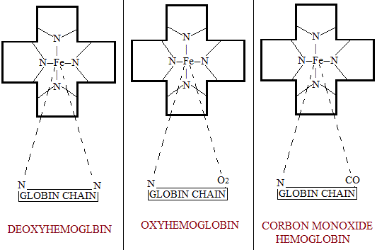 - The iron of heme is attached to 2 imidazole nitrogen of 2 histidine residues of the globin. One of these linkage is quite stable. But the second linkage of the heme iron with the imidazole N is very loose and in the presence of O2 this linkage gets attached to it forming carbon monoxide Hemoglobin. These changes are show in the figures given below. However, there is evidence that this valency of heme iron in case of hydroxyl-Hemoglobin binds a molecule of water instead of being attached to imidazole of globin chain.