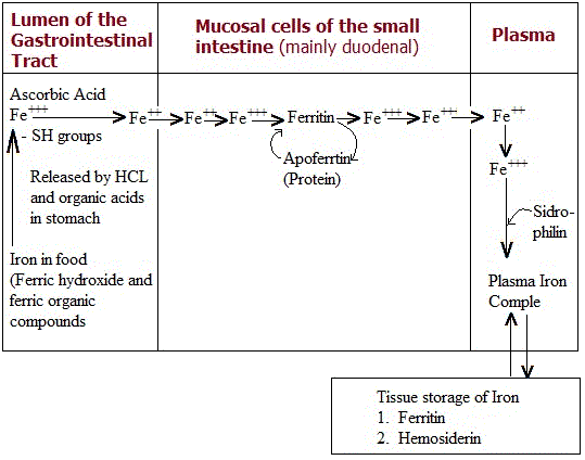The absorption of iron is quite incomplete and only about 10 % of the iron taken in food is absorbed. In general the mean iron absorption from animal food is twice that from vegetable foods. Most of the food iron occurs in Ferric (Fe+++) state either as ferric hydroxide or as ferric organic compounds. These compounds are broken down into free ferric ions or loosely bound organic iron in the acid medium of the stomach contents where acidity is due to the gastric HCl as well as organic acids of the food. Reducing substances in glutathione convert Fe+++ iron to reduced (Fe++) form. In the Fe++ form iron is more soluble and is more readily absorbed. The gastric HCL is however not essential for iron absorption because achlorchydria iron absorption is not always decreased.